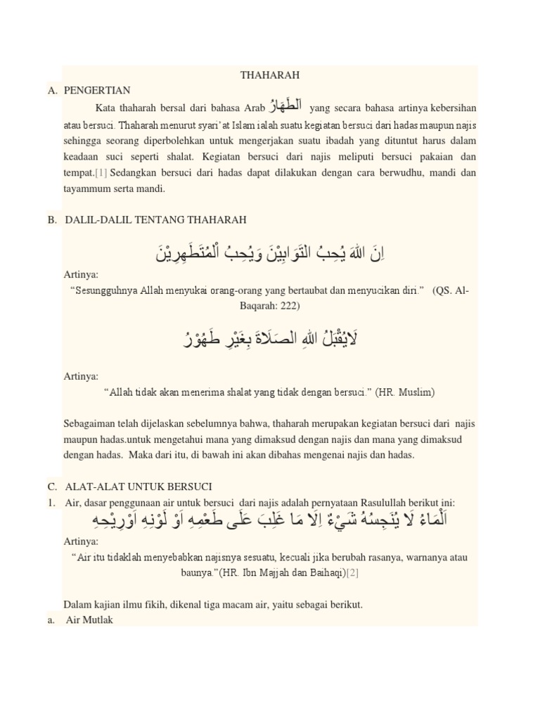 Pengertian, syarat, rukun, sunah, hukum, larangan, macam, cara, dalil dan hikmah. Sedangkan menurut hukum syara', thaharah artinya suci dari hadas dan najis. Suci dari najis ialah menghilangkan najis yang ada di badan, tempat dan pakaian. Kebersihan diri dan tubuh badan daripada hadas, kekotoran dan najis untuk menjamin kesejahteraan hidup dan amal ibadat diterima allah s.w.t. Suci dari hadas dan najis.